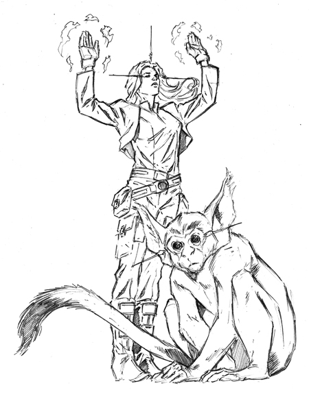 Anyway, this got me sketching, so the next few posts will be from my playing around with these characters. Since I mentioned Willow specifically, I’ll start with her; especially since I changed her costume the most. I’m starting from the beginning of the series, so remember…Willow can’t see. She uses her powers to let the monkey act as her eyes. Ok, I admit, the angle didn’t really work. Instead of a low shot with her pet in the foreground, the sucker just looks like a gorilla. Oh well. We try.