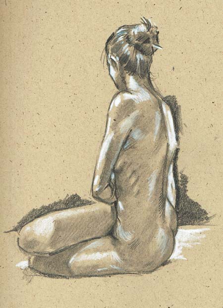 In the next session, when the same model returned, I picked up where I left off. I decided against using those fancy markers, or the soluble pencils, and just drew; keeping it simple.