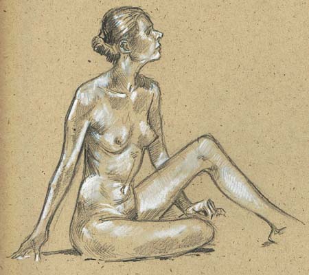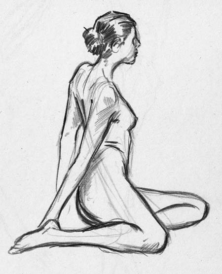 To make up for missing a post on Monday, here’s a double whammy; actually these are two weeks worth of model sessions. We had the same woman both times, and she was impressive. She must have been a trained dancer, for all her poses were very open, and she held them incredibly well for extended periods. There was very little “drift” (as I call it) from the start of her pose to the end. She has beautiful long hair, but she never let it down except to re-braid it during breaks. If we ever have her back, I may try to get her to let it down for a bit of variety. Regardless, she was a joy to draw.