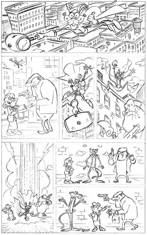 On this, the last page of the book, there was a cameo by another of Panther’s stable characters. At the time I drew this, we didn’t know if we could use the TV/Theater shorts version of the Inspector, or if it had to be the version from the movie credit sequences. I know people have attachments to each version, but I grew up watching the cartoons on TV, so my fave is the one voiced by the late Pat Harrington, Jr.; which I did not know was also Schneider on “One Day at a Time” until my wife pointed it out. It’s so obvious now when I hear him!D’oh!