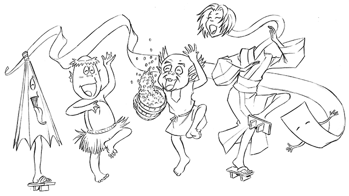 Left to Right: Kasa-obake (a ghost umbrella- go fig?!), a Kappa (sort of a turtle that drowns children), Azuki Hakari (a bean counting poltergeist), a Rokurokubi (woman cursed with a long, snake-like neck), and the previously mentioned Ittan-momen (parchment/cotton roll)
