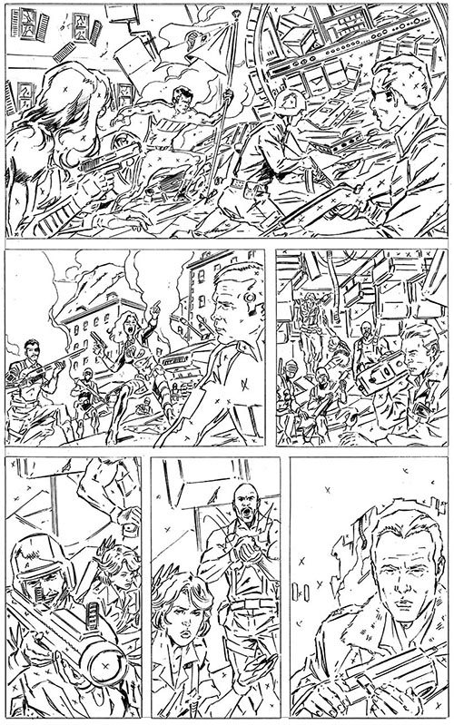 A) Since the second issue of GI Joe vs the Six Million Dollar Man hits this month, here are the pencils from the first few pages… I really enjoy drawing Richard Anderson (rest his soul). I always expected that’s what a boss is supposed to act like, but only one ever did— and she was a great boss. If you want a cute story, ask me at the show about when I met him and Lindsay Wagner at a con, it’s not too long, and shows how sweet they are as people.