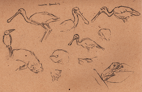 This last page is from the Amazonian house at the Zoo. They have fish, amphibians, birds, trees, plants… but most of these drawings are of the Roseata Spoonbill. It’s pink, so some kids think it’s a flamingo, but it’s shorter, with more of a pelican beak. I’ve seen this thing twice, and on both visits he’s taken a bite at people. I warned a kid off this round, but even as I was exiting the building I heard a mom talking about the thing saying, “Yeah that spoon beaked thing snapped at a kid!” They’re wild animals people, what did you expect? Keep your fingers to yourselves. Sheesh! Everyone thinks they’re Dr. Doolittle.