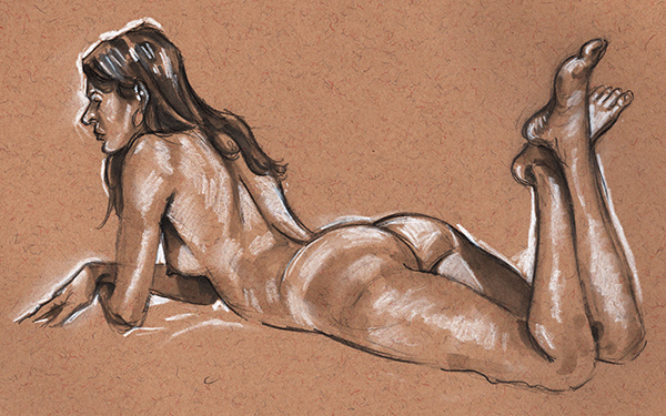 I admit it… I’m a nut case when drawing. I use a timer, and base what I should be doing on how much time I have left. In a 20 min, I usually sketch in the figure out for the first 10, which gives me time to position the drawing on the paper, start over if I didn’t leave enough space, get proportions down, some face/hand/feet/hair details, etc… I’ll drop in grayscale for the next 5, then highlights and tweaks for the last bit— BOOM, 20 min. done. I don’t expect to be half way in, then have the pose cut off randomly; least of all for a non-emergency phone call. Ugh.