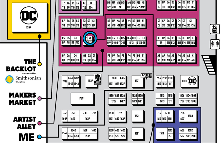 Here’s a confusing map to lead you astray, but we’ll basically be between the DC and Dark Horse booths. Do they care? Are they excited? Nope, they don’t even remember I’ve worked for them in the past… like an old girlfriend. On the positive, we’re not far from the bathroom! Swing by if you make a pit stop… just wash your damn dirty paws!