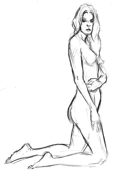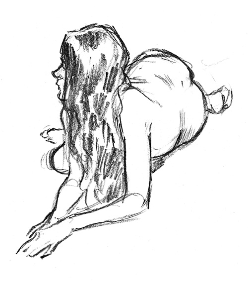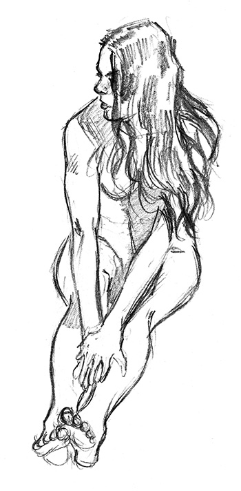 In this 10 min. pose, the foreshortening was a challenge, as was her form through the cascade of hair. I wish this had been longer, I’d have loved to developed this one more.