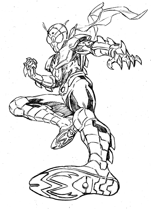 Here’s a sketch I did of Jordan Gibson’s MANTIS, his homage to all the tokusatsu shows we both love. Come back later for the inks!