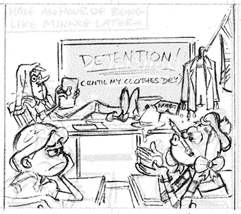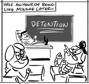 And then below is what I draw. You can see the original strip beneath mine, which I use like a blueprint… literally; because I print it out in blue and draw over that. For this panel I added some details to explain why the girls are in detention to begin with. Thankfully Craig didn’t mind my additions.