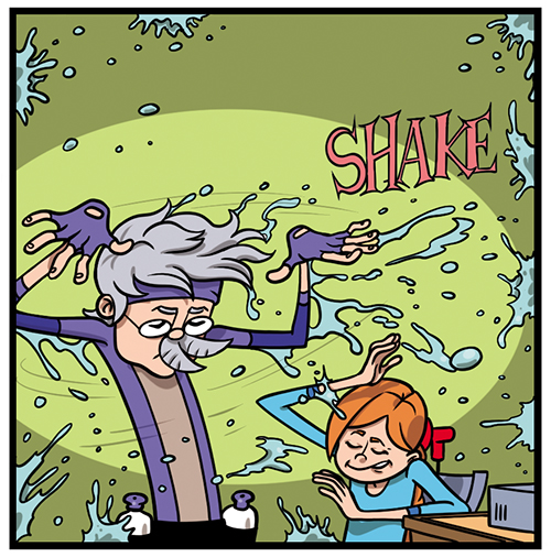 I was going to make a “Shake it”–Taylor Swift reference, but I’m too old to get away with that. Sometimes I like to break the fourth wall, or in this case, just acknowledge it. It’s fun to have the characters act like the panel borders are actually present, or in the way; like here with the water splashing against them.