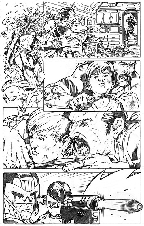 This the first page of six samples drawn for 2000AD/Judge Dredd, based on a sample script they’ve been using for a while. If you do a search, you can find various other artists who have taken a stab at it. No pun intended, despite the knife.