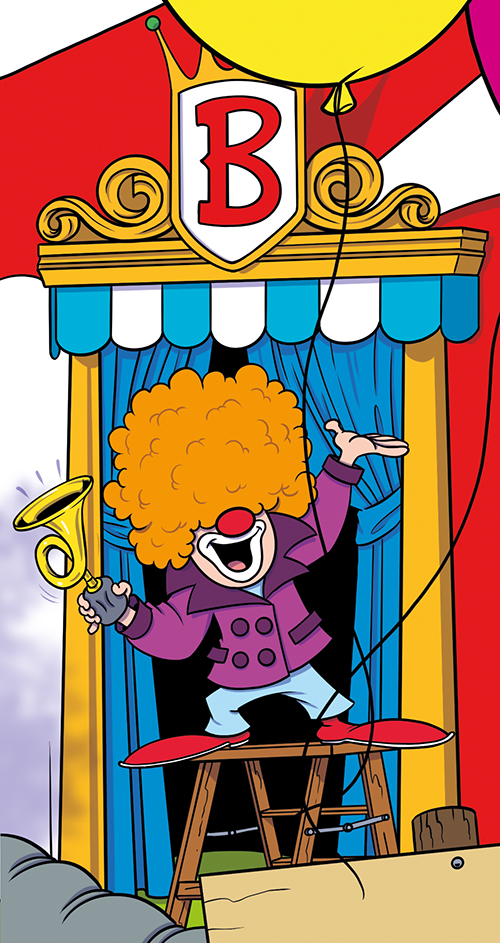 As I mentioned on Monday, there was a missing clown design when I started to draw the joke page for this week’s issue. I had a place holder for the part, but drew him as a classic American Bozo. I went with Willard Scott, they went with Billy Barty! I had to adjust my layout but I didn’t want a total redraw. Like Hollywood does with short leading men, I gave him a lift.