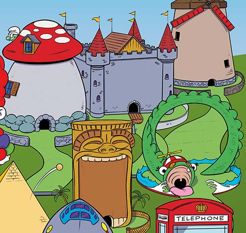 So here are the colors to the peek of the putt-putt course I showed earlier. There’s a smurfing good reference in it, plus a nice nod to Beany and Cecil. Again, I guess this stuff might amuse the parents, because I doubt the kids will get any of it.
