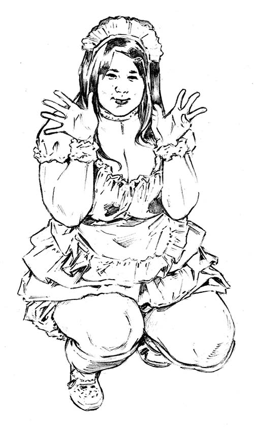 Recently, there was a Twitter post of a Maid Cafe in Japan that had an all plus sized, staff. The ladies looked so damn happy, and cute. Drawing full figured people is a challenge, and I wanted to capture the kawaii nature of the ladies… I hope I did her justice.