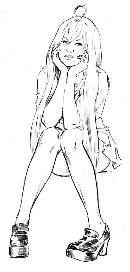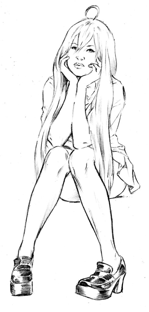 This is a non-life drawing based on a shot of a cosplayer, but I don’t know the anime reference; sorry. I’ve been re-reading “Creative Illustration” by Andrew Loomis, and he talks about approaches to using photo reference. One point he makes is that just because something is in the shot, doesn’t mean it has to be in your image. Here, the young lady had a button in her hair, and a devil tail, but I left them out. I considered dropping her cowlick as well, but decided to keep it.