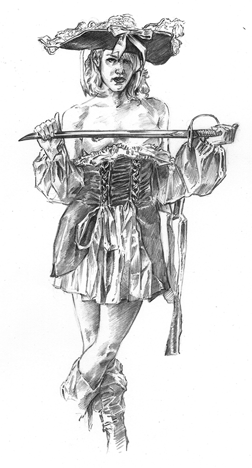 Another of the pirate themed images off the sketch sites. It was originally done in “lavender” and “violet”, so variations in purple. Once converted to gray (as seen here- and more about that in a minute) it lost the separation created between the color changes. Her hat, and corset were done in the darker lavender, while her skin, boots, skirt, and blouse, were done in the violet, which was softer, and leaned to red. The original was a challenge, with all the drapery, lace, ribbons, but had a nice look to it because of the color shifts.