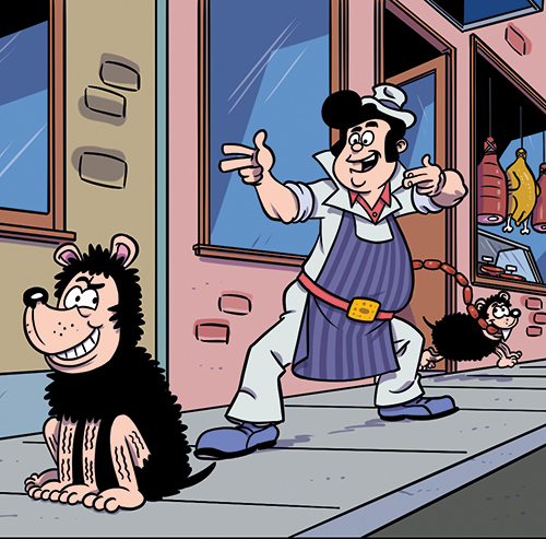 Apparently, the butcher in Beanotown is a huge Elvis fan, but how many kids there know the King? I really tried to play up the Elvis reference in the character, with more than his hair and blue suede shoes. I think a lot of Elvis is also how he moved, hence the hand gestures, and stance. Plus, Gnasher, who doesn’t love Gnasher?
