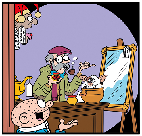 As to the shop itself, I tried to put in some Easter eggs, but the first thing I thought of were those old pharmacy signs you find around Europe. They’re just heads with pills on their tongues, but so odd, and creepy.