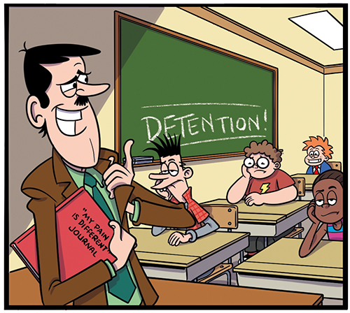 This may look like it’s part of the same strip posted earlier this week, but it’s two different ones; they both just happen to be set in a classroom. I love sneaking Easter eggs into panels, and this one is a reference to the late musician/poet Maggie Estep. It still makes me giggle.