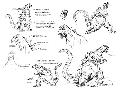 The studio asked to see how I would draw Godzilla, and my first reaction was to stare blindly into the sun. What? Seriously. WHAT?! I’ve spent hours, days, trying to get the Godzilla I’d been drawing to look like specific versions from film and animation, without just looking like a photo tracing. My version? I want to draw the one I enjoy as a fan! Sure, depending on the type of story, it may shift from alligator-zila, to puppy dog eyes, or one of the other film variations; but still!