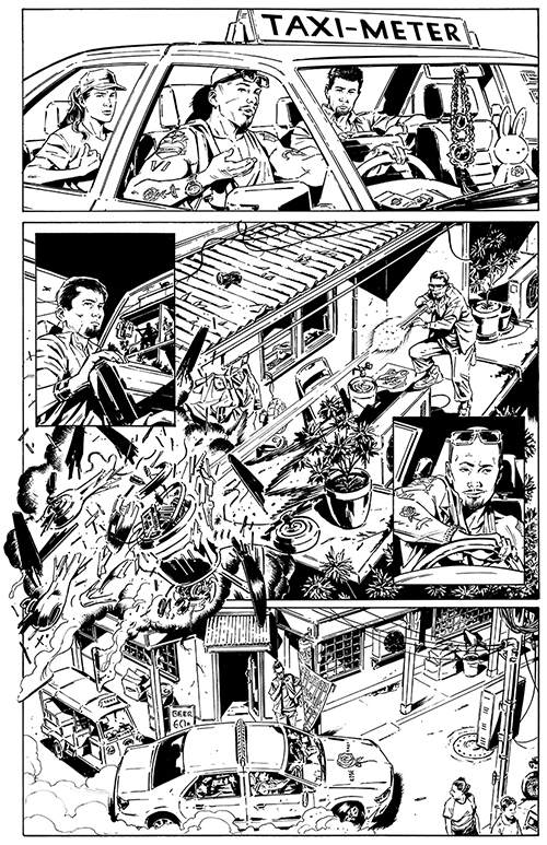 Here are the inks for the page of pencils I posted previously. This was my first chance to ink an issue of Joe, and I wanted to do something more like Guice/Perkins/Lark (albeit not at their level of skill, I admit). I’m a pen pal with Butch Guice, and he’s always down on his stuff, which his worst is still miles above my best. I emailed him after I did the issue and told him, I finally understood why he never liked anything he does. To me, it isn’t that it’s bad, but rather the frustration that things never come out at the level, or up to the potential, one thought something had; Butch confirmed this idea.