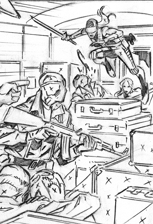 More from the issue dropping this week. This is a tiny corner of a panel, but for some reason I was really happy with the pose. I try to make sure handles on guns, swords, or whatever, are the proper thickness, because how can you maintain a grip on something too thin? A lot of guys will make them the width of a pencil for no apparent reason, but who knows. Even when stuff is tiny, as this bit will be in the final, I want it to feel right. This is either not that bad, or I’m punch drunk from the lack of sleep. Probably the latter.