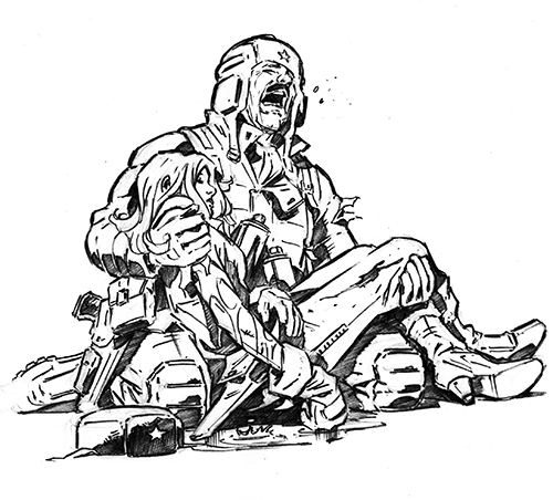 Sometimes you see a shot, and ask… “Wonder if I’d have drawn it that way?“. In an issue before my restart, a panel caught my eye, and I tried a couple variations on it. Keep in mind the script specifically asked for a “pieta” like pose, so I’m taking liberties. There’s never enough time on a book, if you want to turn it in on time ( which is usually b/c the script was late), but since I’m not on a deadline… I get to play with it.