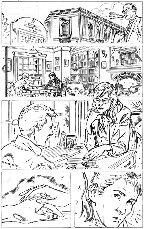 Living in DC, it’s funny to pass buildings you grew up seeing on TV; especially those you have strong associations with. The Russell building was used for the exterior of where Oscar Goldman was supposed to have an office; so of course I had to drop him in there. The woman on this page I thought was going to be a one off, so I based it on a friend; but she ended up being a regular. The man was loosely based on John Barrowman- who luckily dressed for the scene.