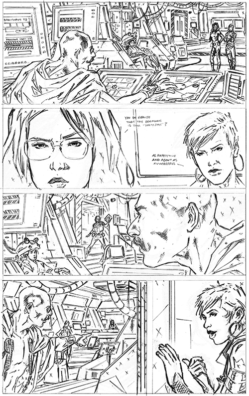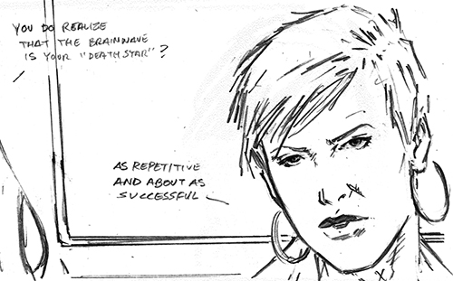 As I mentioned before, I hate rooms that are set up as a box, and it’s especially annoying when it’s a place that you go back to over and over again. Mindbender seems to always be in a lab, so that worst thing you can do is make it a galley kitchen set up. Here I tried to have a space that was almost like a sitcom set up; think of the sets for Odd Couple or Married with Children. There’s an entrance landing, then a “couch” area, then a “kitchen/dining” space. A lot of shows use this, but it spreads things out so there’s some variety in your shots. I expanded the room even more, so the brainwave becomes the couch, and the controls are in a side area.