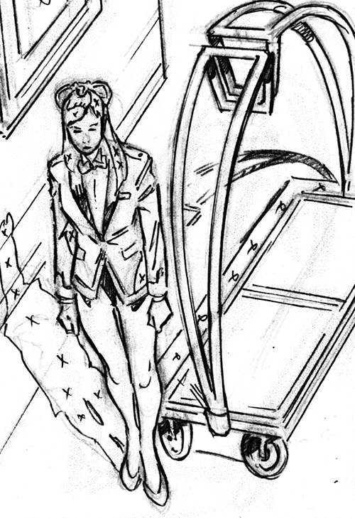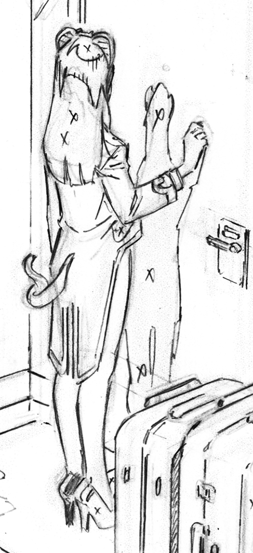In this scene at the Cobra casino and resort, the bell hop uniform was supposed to be modeled after the Playboy club outfits from days past. I didn’t want to show off too much skin, as I already thought we were pushing it. In lieu of bunny ears, she got the top of the cobra logo, as a tiara like fascinator. Instead of just the one piece bathing suit the old Playboy bunnies used to wear, I have her a traditional bell hop jacket with tails, while instead of a puffy cotton ball on her bum, I made it a serpent tail. You’ll note that the cuffs of the jacket also have a nod to the cobra logo (as seen below).