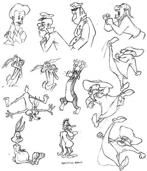 More toss away character designs from (mostly) Chuck Jones cartoons. The whole right side is from “Touché & Go” a Pepe cartoon from 1957. The opening characters are fabulous, especially the street painter. His abuse of the dog in the scene didn’t age well, but the motion in the shots is incredible. While in “The Mouse on 57th street” from 1961, the two silly cops are my favorite bits. I love the body language all those characters have.