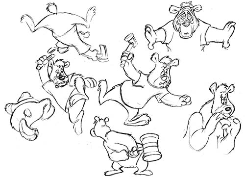 The Looney Tunes with the three bears were always a love hate for me as a kid. I enjoyed them, but I always felt the Dad was a bit mean. I get it, it’s his role, but it went a bit far sometimes. As I’ve gotten older, I’ve learned to enjoy the absurdity of them, and especially the Dad’s “takes” in a lot of scenes. These are from “What’s Brewin’ Bruin” (1948). The final shot when the Dad opens the window as spring arrives is brilliant; oh, that face! The hammer poses are random stills during his flurry of movement while nailing up a window. Again, watching these things in slow motion is something every cartoonist should do.