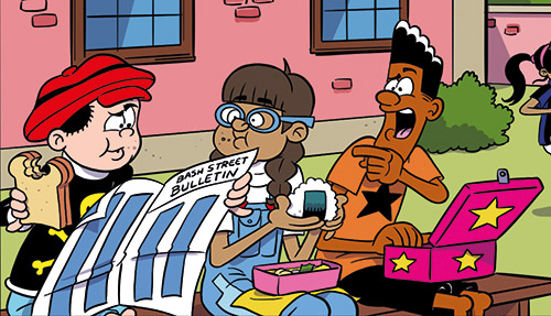 From this week’s Beano, where the kids are seen eating lunch. I wanted to mix it up, so I had Harsha eating an onigiri out of a bento box. Wonder if anyone noticed?Well I thought it was fun. Plus, they’re yummy.