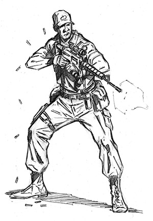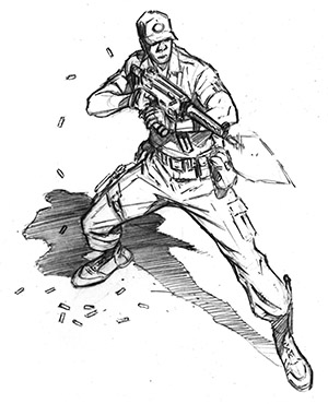 Of course a bunch of guys will immediately claim they would have come up with the perfect image; because I suck, and they’re undiscovered geniuses of comic art. OK, let’s say you do have the one shot that works perfectly, but know what? Over a decade of drawing hundreds of gun fights in G.I.Joe, I probably drew your prized answer, and guess what the problem is now? There’s another gun fight on the next page, ten more in the next issue, and you can’t repeat yourself; because people will point out your monotonous solution.