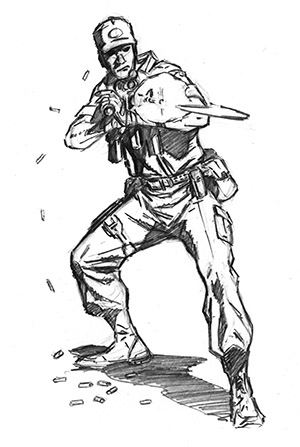 Part of the reason is that my experience in comics has been less capes, and more cops. When drawing “normal” people, I’ve tried to make what/how characters do things, believable. The problem is, that usually isn’t exciting to begin with. Unless you’re bulletproof, when you’re being shot at, you generally don’t want to expose yourself, because like Bruce said “Boards don’t hit back”, unfortunately bad guys with guns do shoot back.
