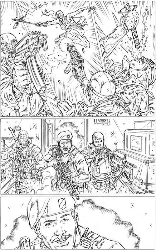 More from GIJoe: Real American Hero; page 18, issue 291. Over my (almost) ten years on GI Joe, I learned way more about guns, and the military than I ever expected to. I tried to make sure all the weapons were accurate, and more importantly portrayed properly. A lot of guys make handles too thin, to where it looks like they’re holding a toothpick attached to a massive sword. That drives me nuts as a fan. Hopefully what I drew not only looked right, but felt as it should.