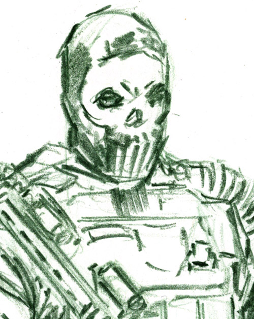 The other paintball guy mentioned in a previous post. This looks odd only because I didn’t draw the stool he was resting on. Shows how important info like that is.